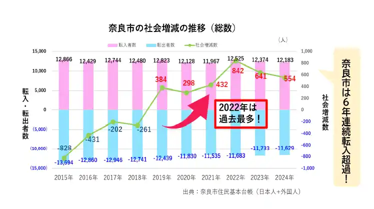 奈良市の社会動態では、6 年連続転入超過(転出者より転入者が多い状態)で、 2024年の転入超過数は+554 人
