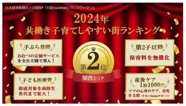 また、日本経済新聞社と日経BP「日経xwoman(クロスウーマン)」が共同で実施している調査「共働き子育てしやすいランキング2024年」では、関西エリアで2位となり、奈良市の子育て支援サービスが高く評価されています。 |