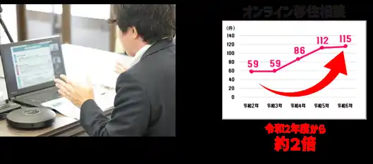 令和 6 年度のオンライン移住相談件数は115件、問合せ件数(資料請求+オンライン移住相談)は、463件で、コロナ禍明けの令和2年度と比較してどちらも約2倍の相談・問合せ等があり、本市への関心が高まっています! |