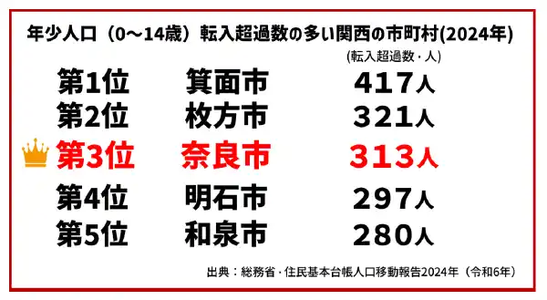 総務省が4月に発表した「住民基本台帳人口移動報告(市町村別)2024年」の年齢3区分(0~14歳・15~64歳・65歳以上)別、転入超過数の多い上位市町村を調査したところ、奈良市の0~14歳の転入超過数は+313人で、関西エリアで3位、全国エリアでは12位にランクインしています。 |