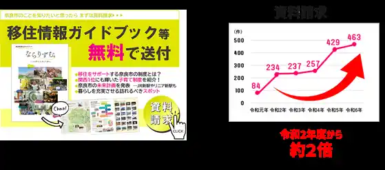 奈良市に移住を検討する方向けに、奈良市で「暮らす」魅力がたっぷり詰まった移住ガイドブック「ならりずむ。」や子育てハンドブック等を、ご要望に応じて無償で配布しています。(資料送付可) |