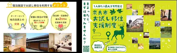 奈良市への移住を具体的に検討している市外在住の方が、2~10泊程度の期間、奈良市に滞在し、家具などがそろった小規模宿泊施設(ゲストハウスなど)での生活を体験することで、移住後のミスマッチを減らし、定住促進に繋げることを目的とする制度です。宿泊費用の一部を給付することで、安価に連泊をすることを補助します(令和3年11月~)。今年度は予算を増枠して実施しています。 |