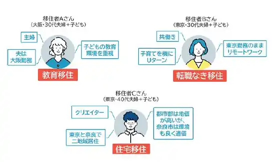 奈良市は、近年、様々な動機で移住を選ぶ方が増えています。特に、教育移住(子どもの教育環境を重視)、転職なき移住(仕事を辞めずに住環境を変える)、住宅移住(理想の住まいを求める)といった、個々のライフステージや価値観に合わせた多様な事例が見られます。 |