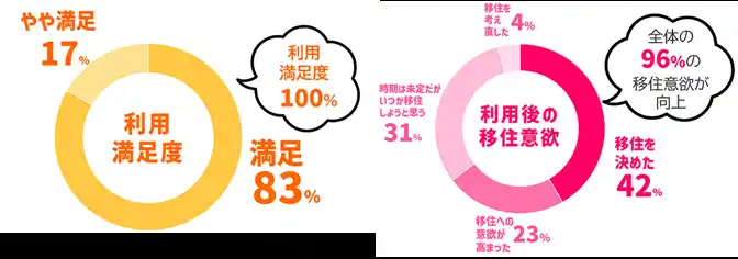 令和6年度の利用者数70人で、計228泊の宿泊があり、利用後アンケートでは利用者満足度100%を達成し、さらに42%が「移住を決めた」、23%が「移住への意欲が高まった」、31%が「時期は未定だがいつか移住しようと思う」と回答し、96%の移住意欲が向上しました。 |
