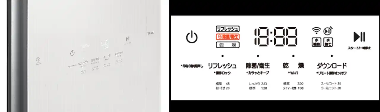 ThinQ(R)」アプリ経由で自分好みのコースを追加ダウンロードし、ライフスタイルに合わせてアップデートできる「ダウンロード」コースの4つに厳選しています。また、他モデルの扉裏にある「ズボン折り目ケア」をなくしたかわりに、棚を標準で備え、ハンガーには掛けられない小物もケアできるようになるなど、コストを抑えながらも便利にお使いいただけるよう、デザインを見直したモデルです。 |