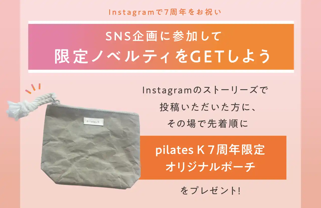 | SNS参加企画で、先着順にて「pilates K 7周年オリジナルポーチ」をプレゼント! | |||