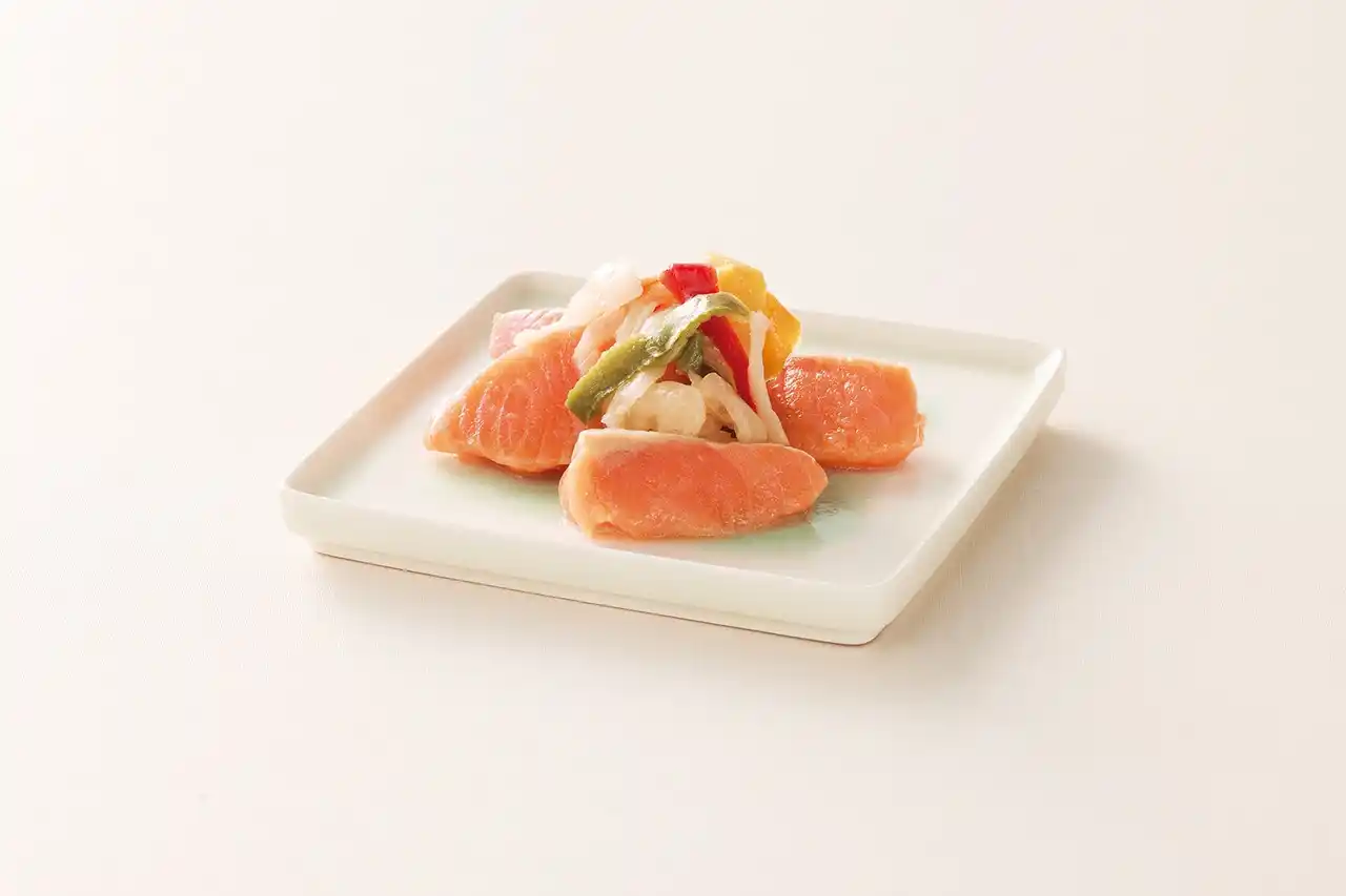 北海道産の脂が乗った岩内サーモン(養殖サーモン)をマリネ風に仕上げました |