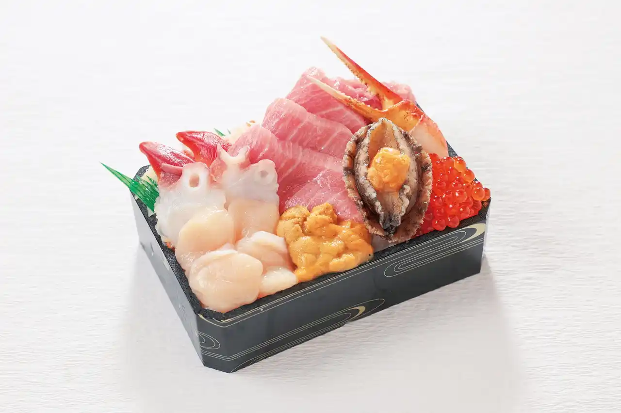 北海道水揚げのまぐろと岩内サーモン(養殖サーモン)に、うにやいくらをのせて。 |
