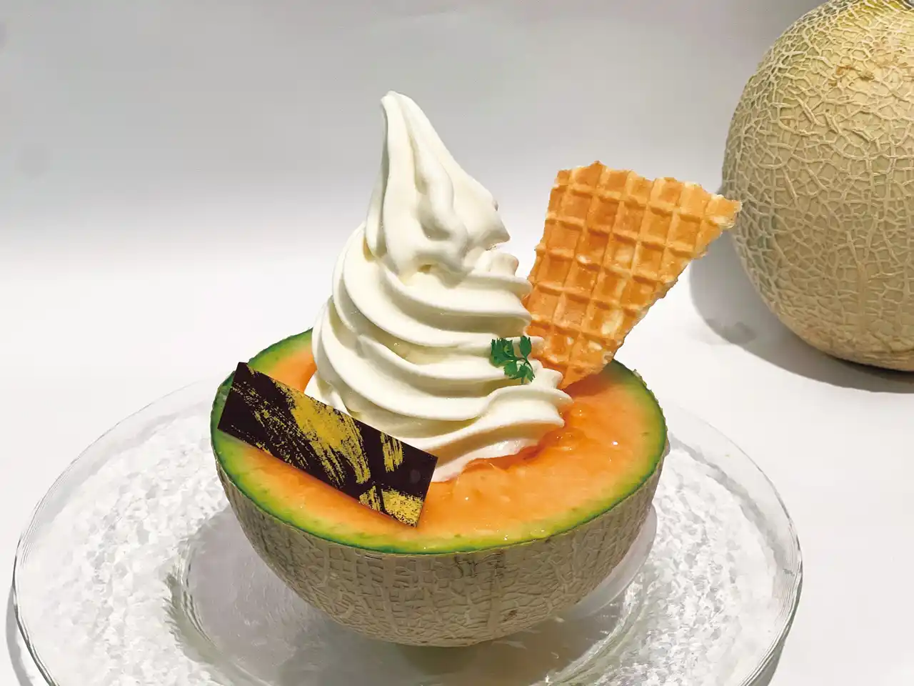 半分にカットした赤肉メロンに、濃厚なソフトクリームを乗せました。 |