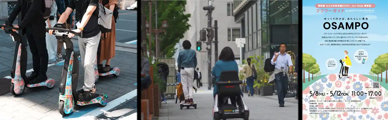 「OSAMPO」はトヨタ・コニック・プロが提供する、最高速度6km/hのTOYOTA歩行領域BEV「C+walk」による“お散歩感覚”での移動と、AIガイドコンテンツの掛け合わせによるその土地の魅力を再発見する新しい体験の提案を目指した周遊観光サービスです。 |
