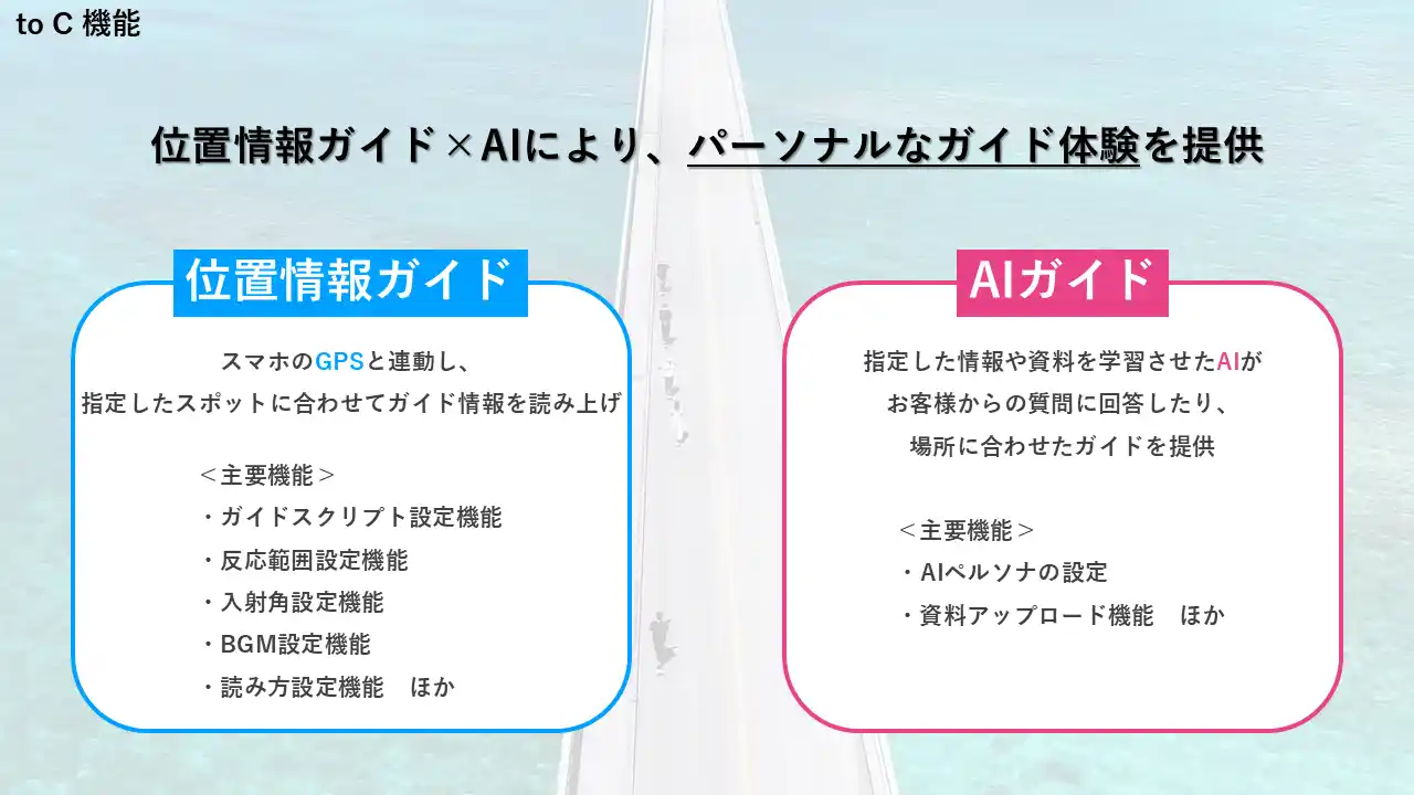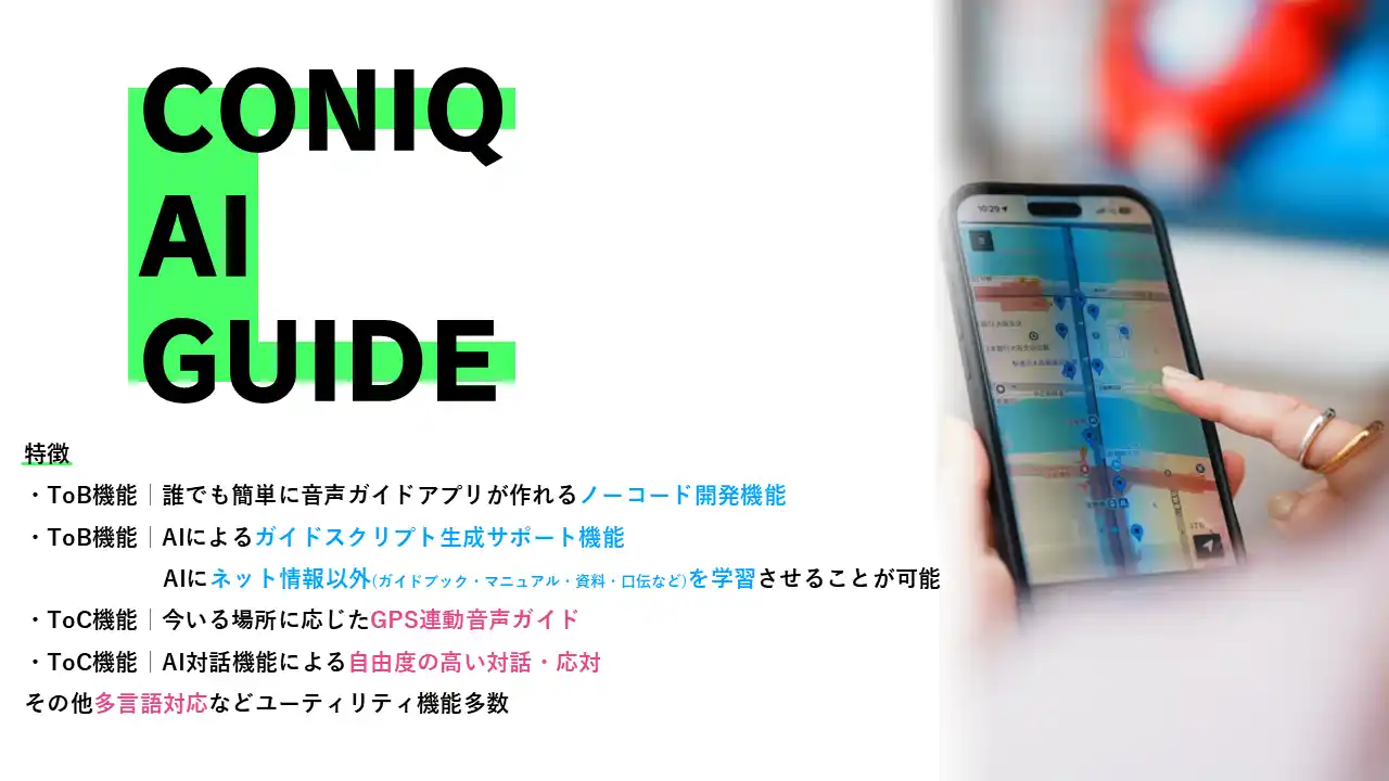 本イベントで提供した「CONIQ AI GUIDE(仮称)」は、トヨタ・コニック・プロとAtlas株式会社(本社:東京都渋谷区、代表取締役社長:宮崎 悠生)が共同で開発を進めています。スマートフォン端末の位置情報と連携した音声ガイドと、特定エリアの情報を学習させ、そのエリアに特化したAIによる質問回答などコンシェルジュ機能の提供が可能です。また、事業者自身でコンテンツを作成することが可能なダッシュボード機能(管理画面機能)も実装しており、低コストでの観光コンテンツ制作が可能です。 |