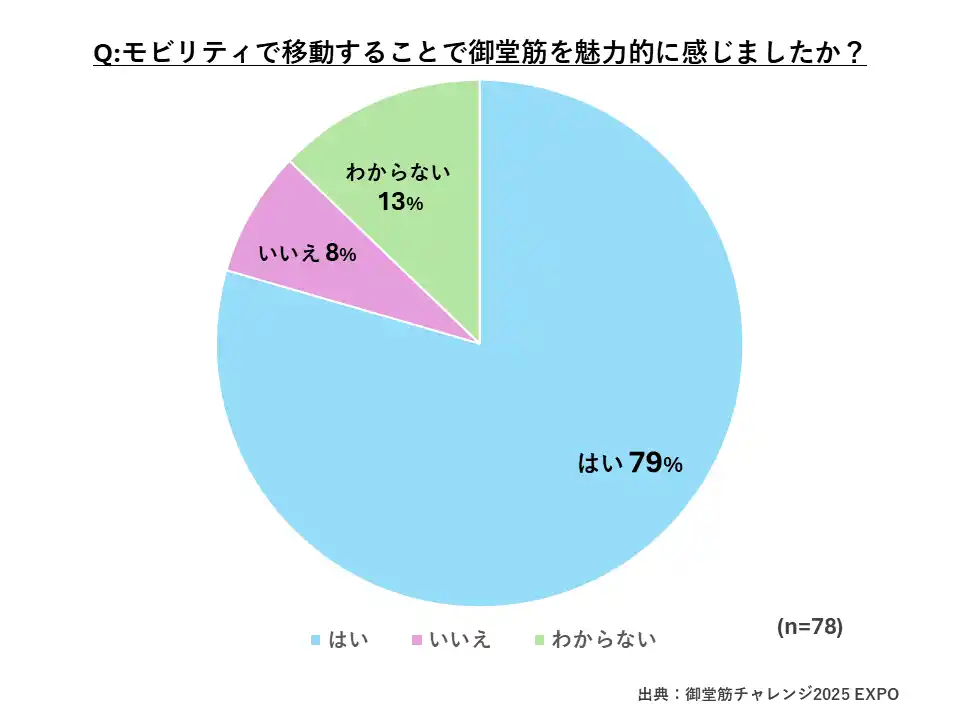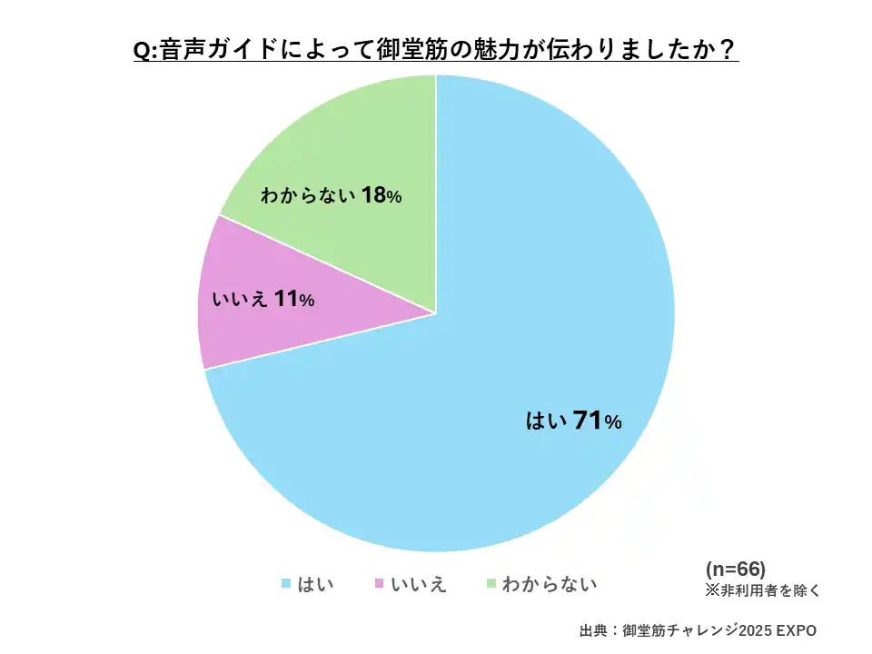 また、AI音声ガイド利用者のうち71%の方が「音声ガイドにより御堂筋を魅力的に感じた」と回答。AI音声ガイドはエリアの魅力度向上に一定の効果があることが確認できました。 |