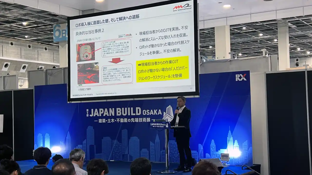 そして、29日の特別講演に、MMI代表取締役社長・橋本修一が登壇。『日本の清掃業界が直面する課題と、その解決策としての新たなビジョン「清掃3.0」』と題した講演を行いました。人とロボットが協働する未来の清掃のカタチとともに、実際に清掃ロボットを導入し、コスト削減と粗利改善を実現した事例を多数公開。業界の常識を覆す新たな選択肢を提案しました。 |