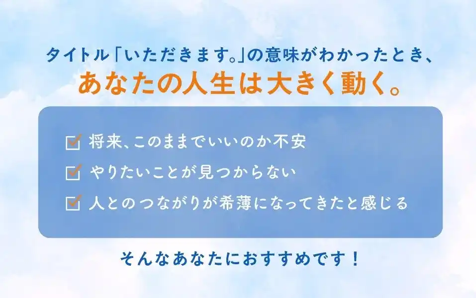 | Audible人気作品ランキング第1位(2025/3/1~2025/3/31)を獲得した、「泣ける」「子どもにも読ませたい」と大反響の小説が待望の書籍化! 喜多川泰・作家デビュー20周年の集大成となる最新作です。「いただきます。」というタイトルの意味がわかったとき、あなたの人生は大きく動き出します。 | |||