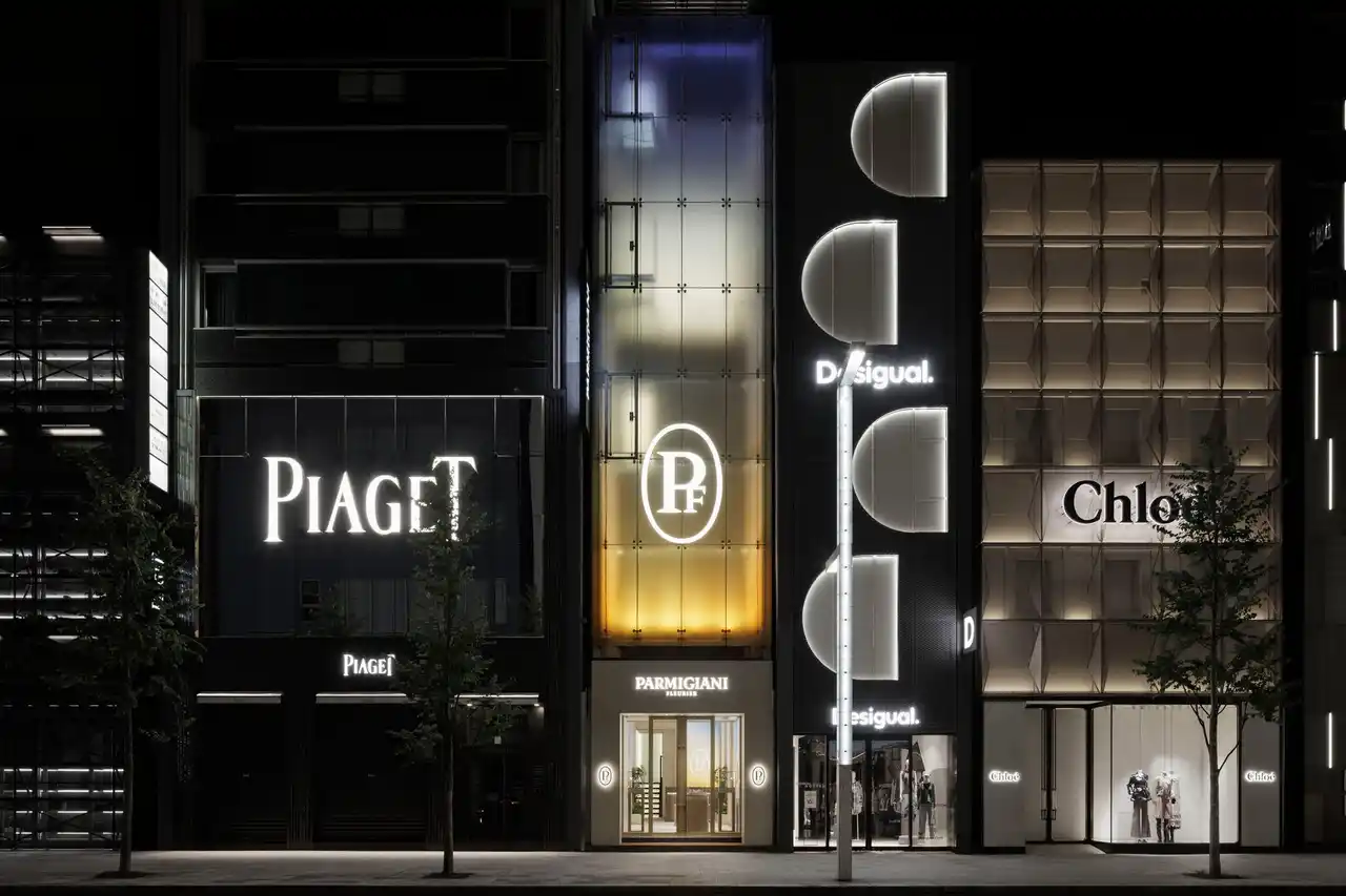 夜明けを思わせる柔らかな光が空間全体に広がり、自然がインスピレーション源であることを示す植物や、メゾンを象徴するギョーシェパターン、熱気球のモチーフが随所に配されています。外観も内装と連動したグラデーションデザインで、銀座にダイナミックな存在感を放ち、隣接するビルへの映り込みで視覚的にブティックのアイデンティティを拡張します。 |