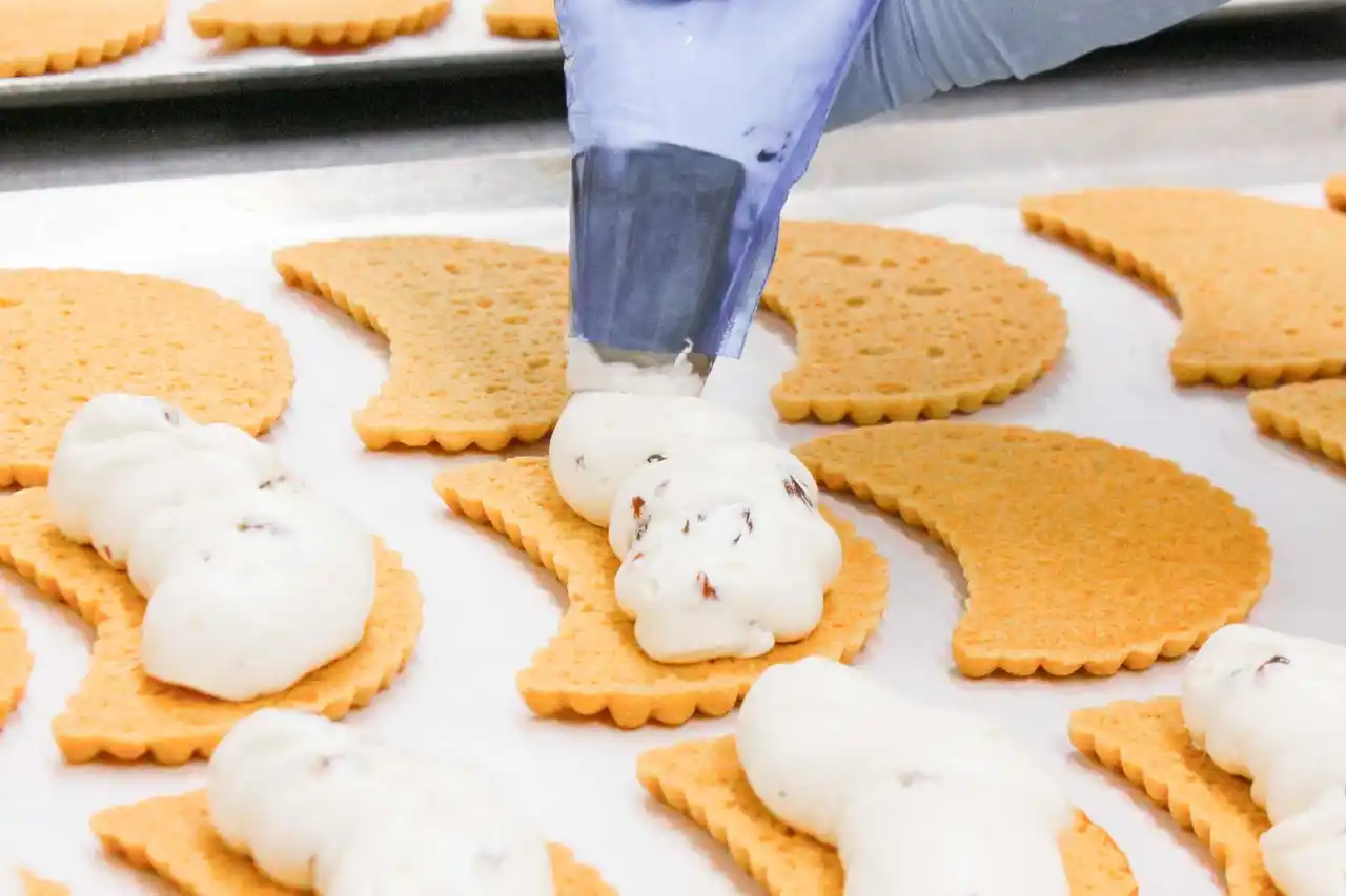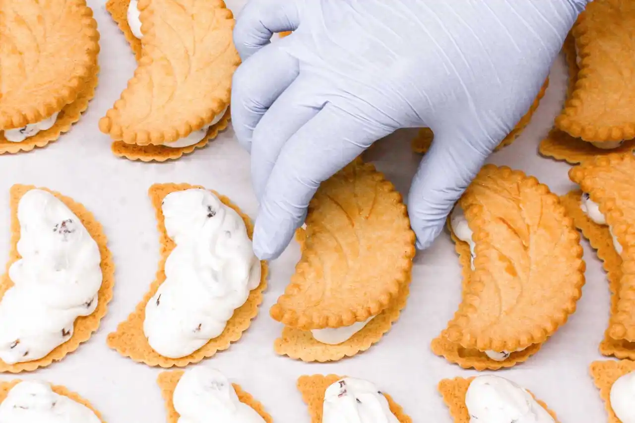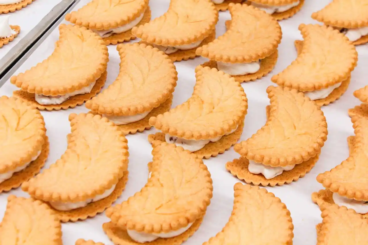サンド用のサブレには、創業以来愛され続けているロングセラー商品「サブレアマンド」を使用しています。良質なバターとアーモンドをたっぷりと使用し、風味豊かに焼き上げたサブレです。 |