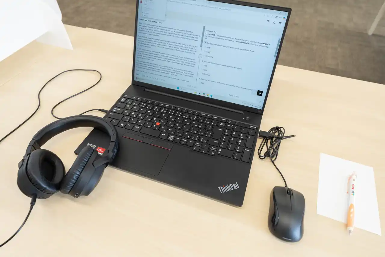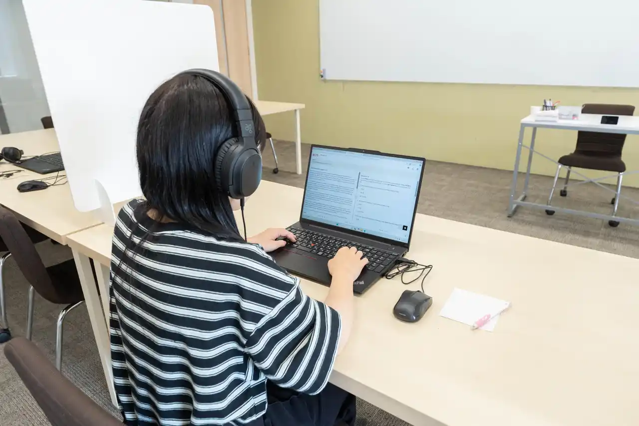 神戸会場ではノートパソコンを採用。授業や仕事で日常的に使い慣れたサイズ感で、安心してIELTSの受験に臨めます。また、ノイズキャンセリング機能付きのヘッドフォンを導入し、リスニング試験により集中できるようにしています。 |