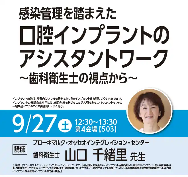 タイトル:感染管理を踏まえた口腔インプラントのアシスタントワーク~歯科衛生士の視点から~ |