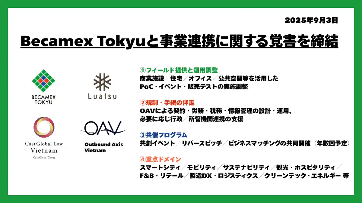 株式会社Luatsu及びCastGlobal Law Vitnam(ベトナム・ホーチミン市)が企画運営する実装伴走プラットフォームOutbound Axis Vietnam(以下、OAV)は、東急グループのBecamex Tokyu(以下、ベカメックス東急)と、ベトナム・ビンズン新都市(Binh Duong New City)を主舞台とした事業連携に関する覚書(MOU)を締結しました。 本連携により、日本発のスタートアップ/新規事業を、現地の都市開発リソースとOAVのリーガル&オペレーション実行力で一体的に支援します。 |