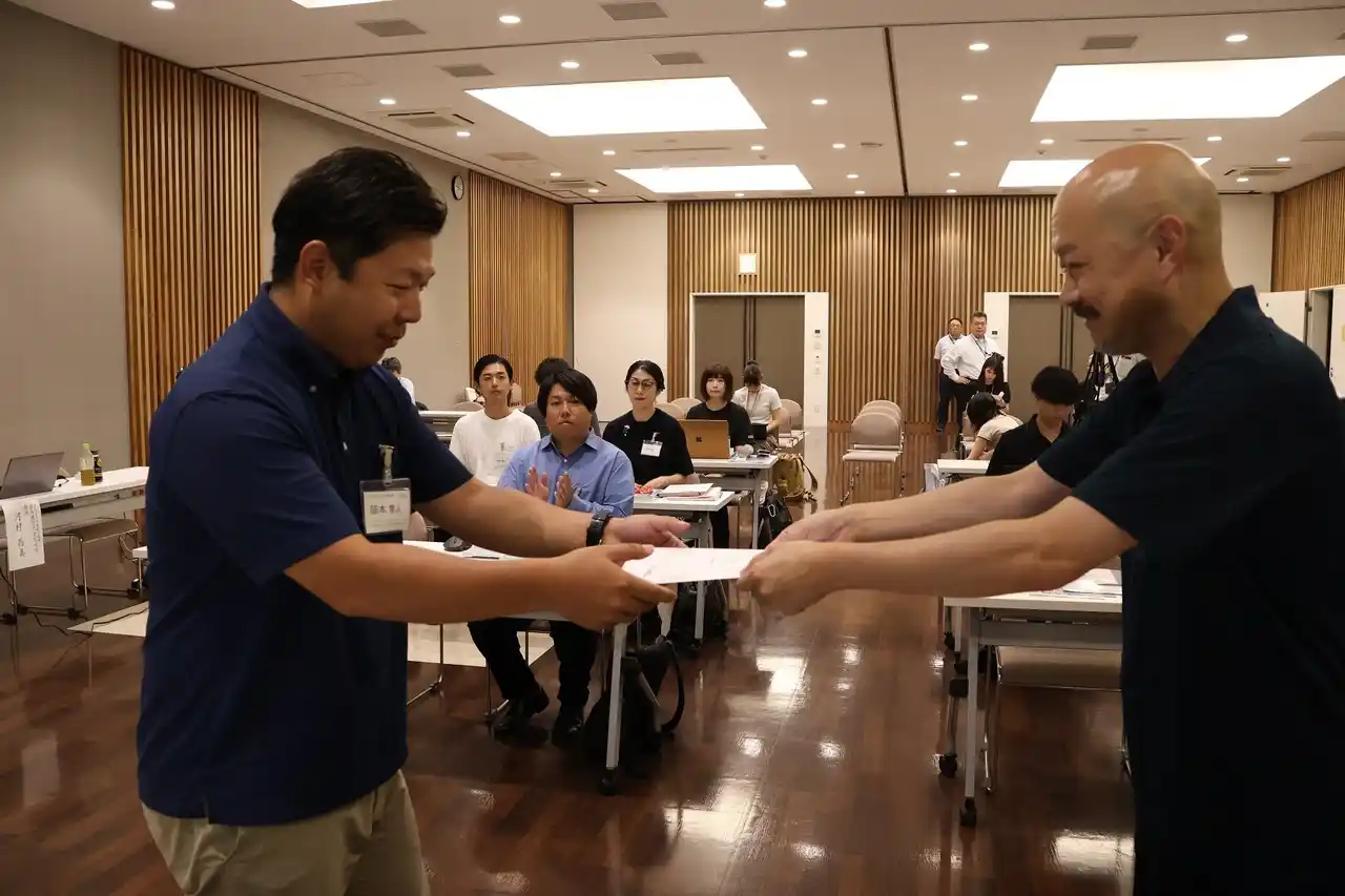 事業構想大学院大学の河村昌美教授(右)から、任命証を受ける三国湊共創プロジェクト研究の研究生 |