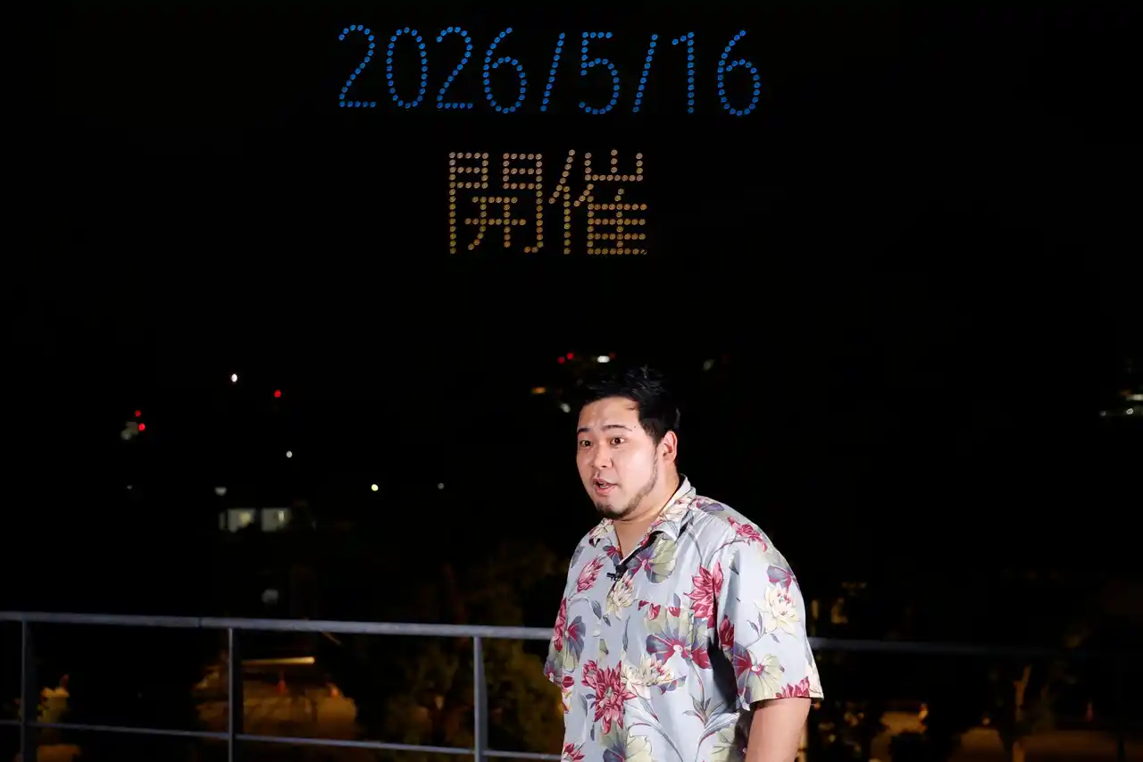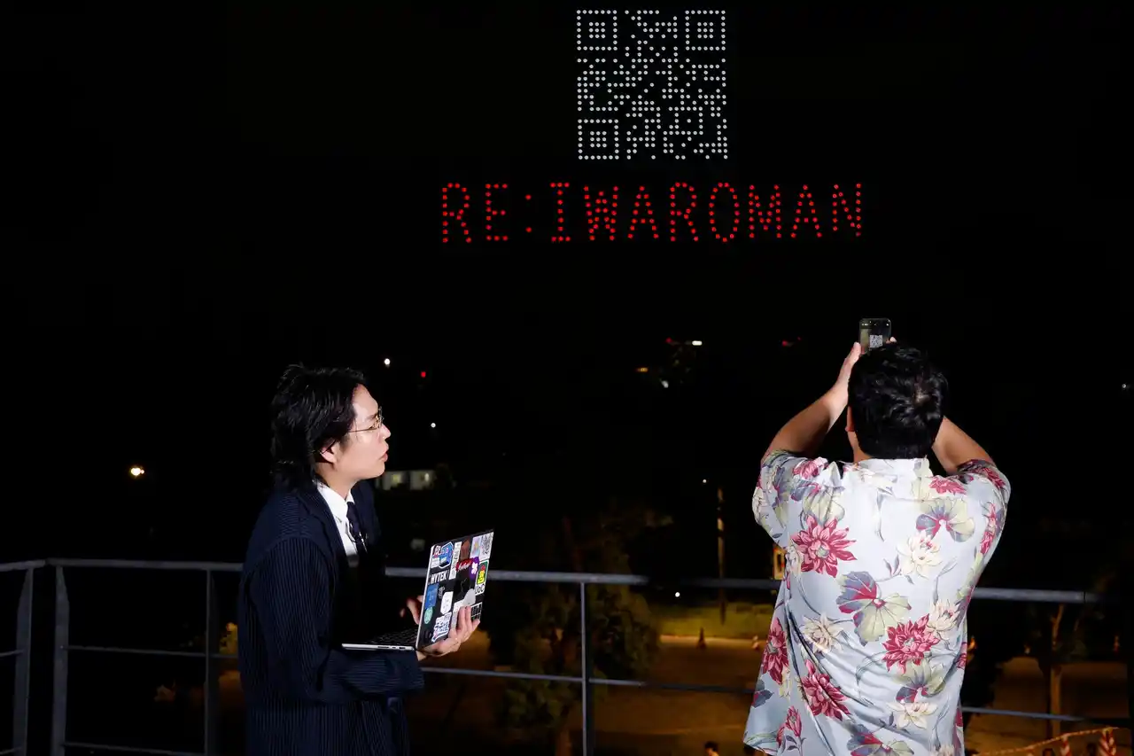 | ショーのフィナーレでは、Kアリーナ横浜で開催される令和ロマンの7年ぶり単独ライブ「RE:IWAROMAN」の追加情報として、開催日(2026年5月16日)やオフィシャル最速先行チケットの抽選受付開始を発表。あわせて、このタイミングで公開されたオフィシャルサイトへのアクセスや、その場で抽選応募が可能となる「ドローンショーQR(R)」(※2)が夜空に浮かび上がるなど、令和ロマンらしい遊び心あふれる演出が盛り込まれました。最後にはくるま氏本人も登場し、令和ロマンの二人が揃った形で華やかに幕を閉じました。 | |||||||||||||