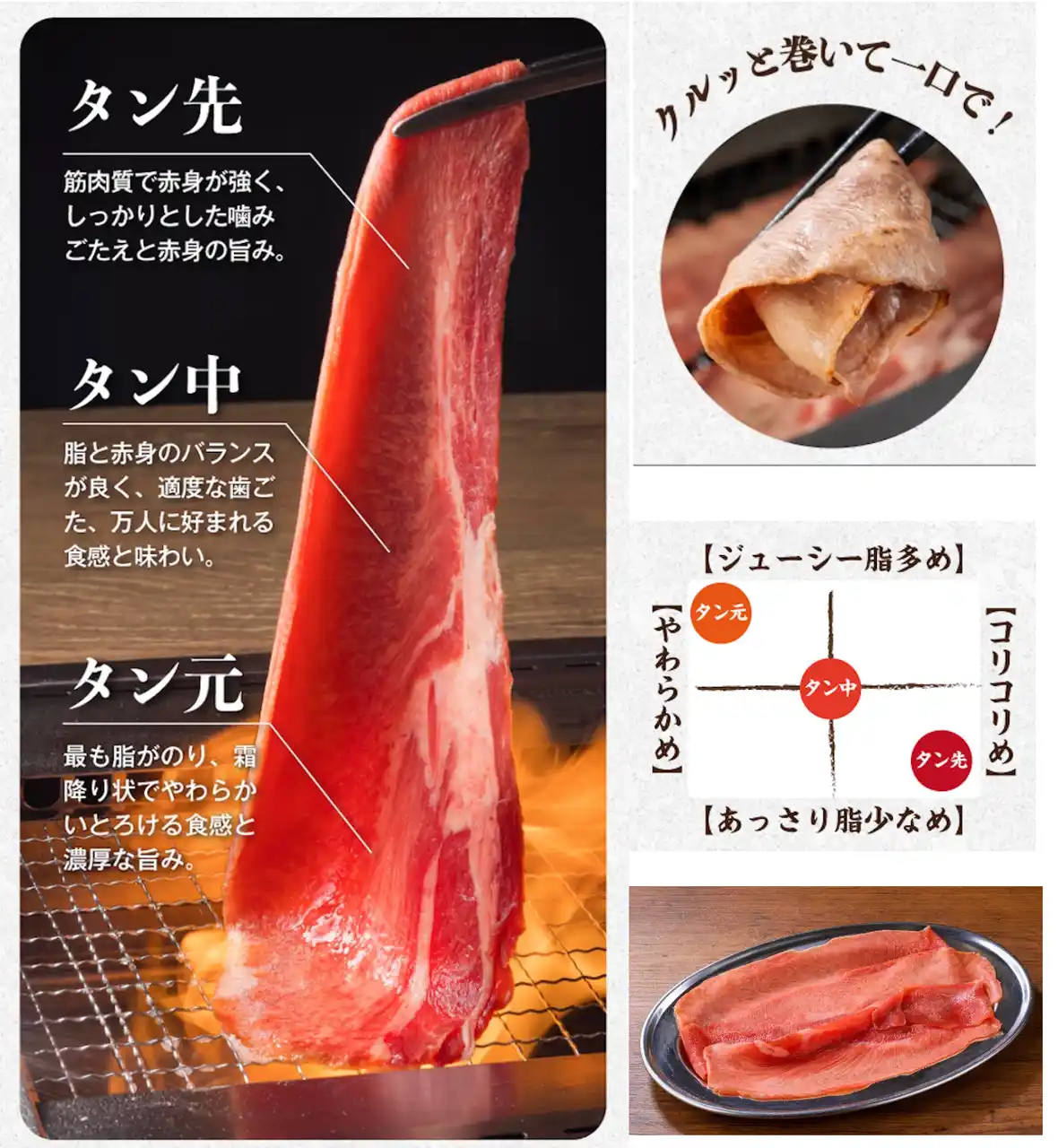 この牛タンは、一本まるごとの魅力を活かした焼肉ライク特別仕様。 タン先の噛みごたえと赤身の旨み、タン中のバランスの取れた食感と味わい、そしてタン元のやわらかくとろける食感と濃厚な脂の旨みを、1枚で一度に味わえるよう仕上げました。 |