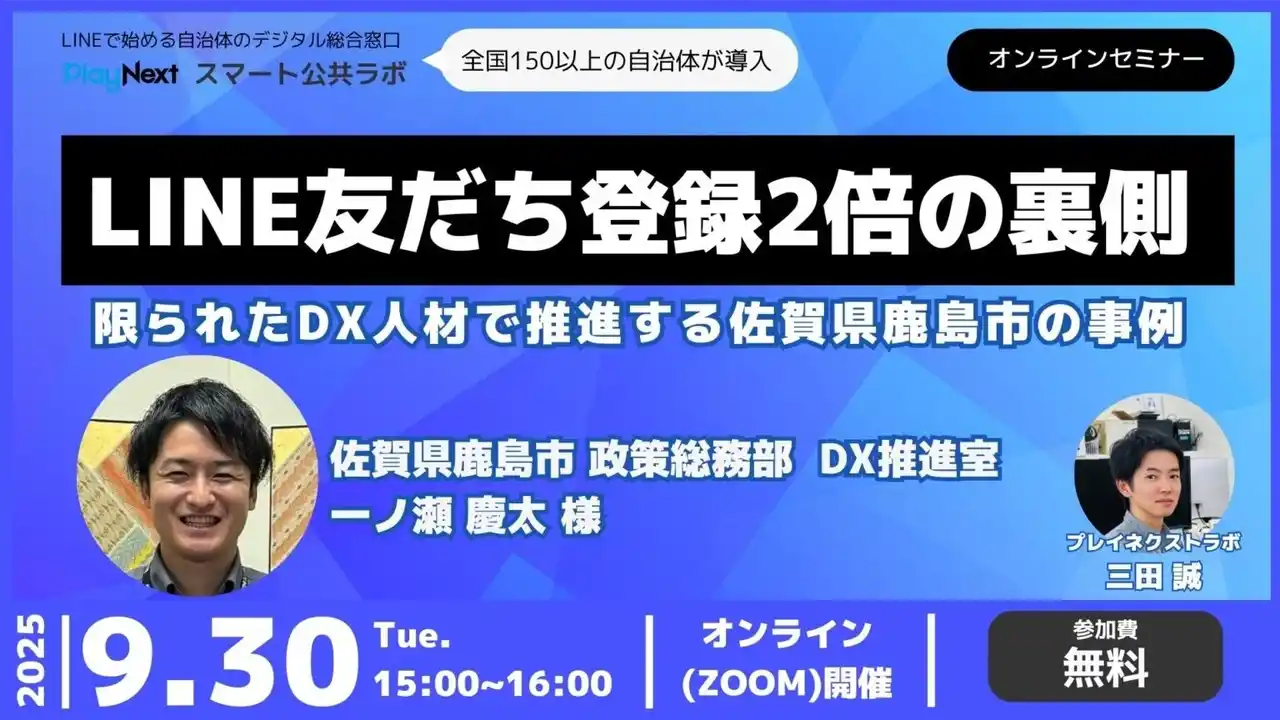 【プレイネクストラボ株式会社】 【佐賀県鹿島市 DX事例】LINE友だち登録2倍の裏側~限られたDX人材で推進する佐賀県鹿島市の事例~9月40日無料開催!
