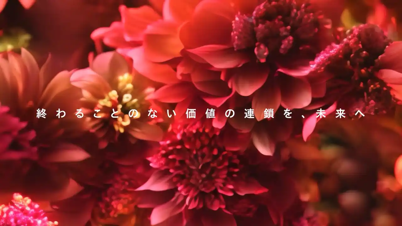 2本目のCMは、未来へのメッセージです。 これからの50年、私たちは形ある製品にとどまらず、サービスやソリューションという「無形の価値」を生み出す挑戦を始めます。 「Value Chain Engineering」の新たなコーポレートスローガンとともに、付加価値創出を加速し、お客様の利便性向上やパートナーのビジネスの成功、そして社会の発展に貢献してまいります。 CMでは、色鮮やかな花が咲き誇る映像と、「終わることのない価値の連鎖」を象徴するメビウスの輪のグラフィックで、その新たな決意を表現しました。 |