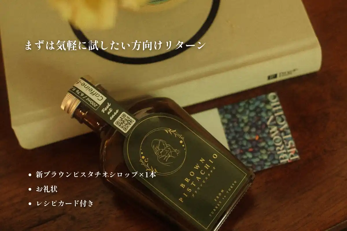 | 3,500円コース:ブラウンピスタチオシロップ1本(190g)、お礼状、レシピカード | |||