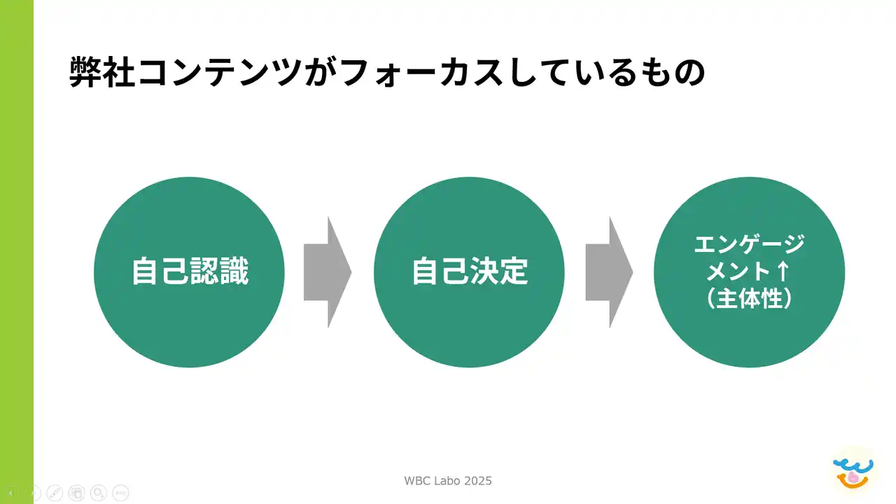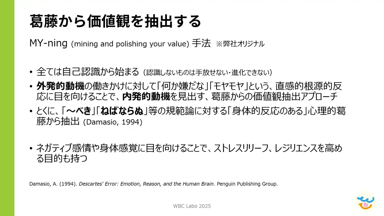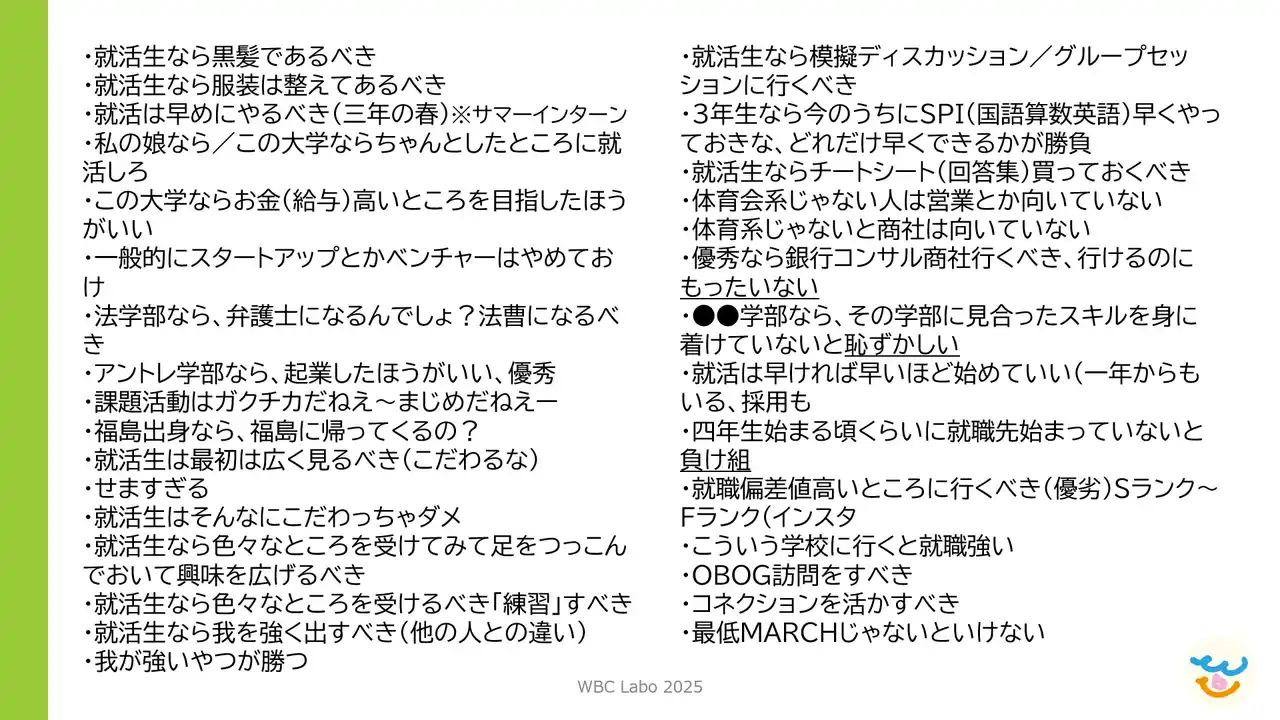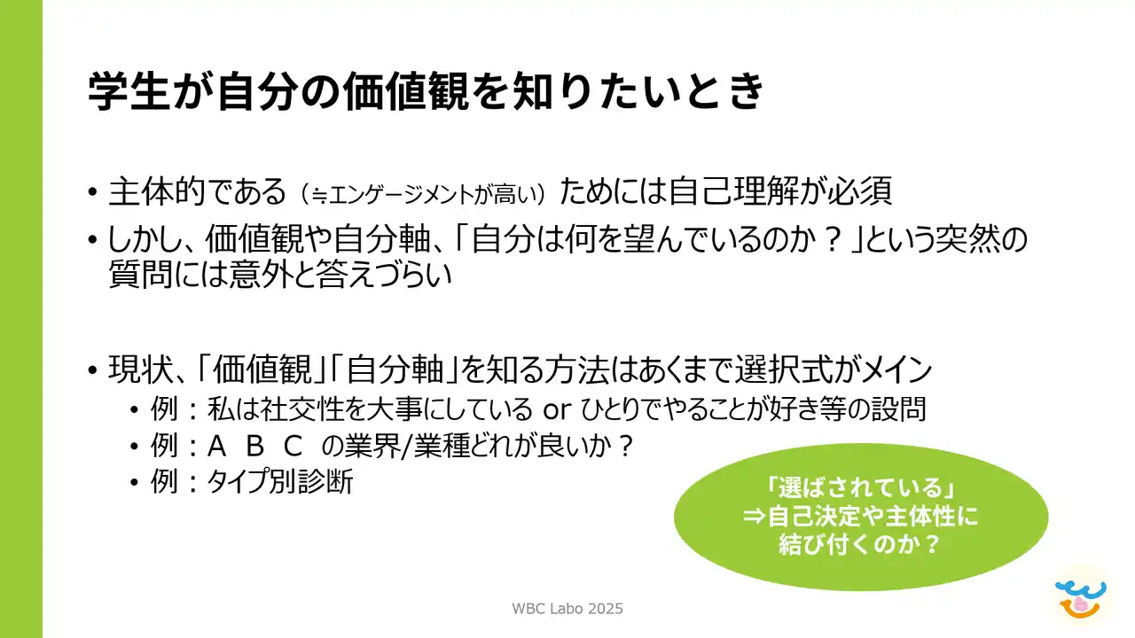 WBCラボでは、型通りの就活が若者のウェルビーイングや長期的な生産性を損なうと考え、「べき論」に接したときに生じるモヤモヤ/葛藤から価値観を抽出して“自分の軸”を言語化する、自己理解とストレスリリーフを兼ねた対話型ワークを開発。さらに事前・事後アンケートで主体性・自己効力感・ウェルビーイングなどの変化を可視化する効果測定を加えました。 |