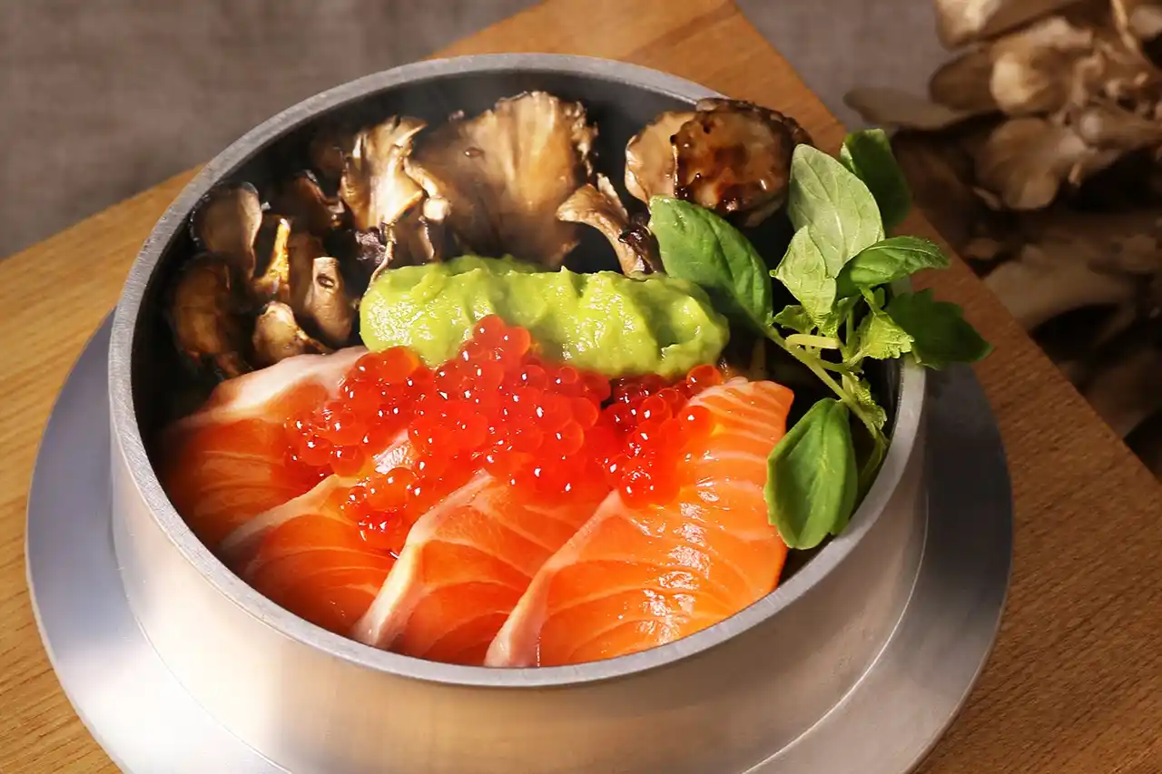 生サーモンと山形産炙り舞茸・アボカド味噌の釜飯 |