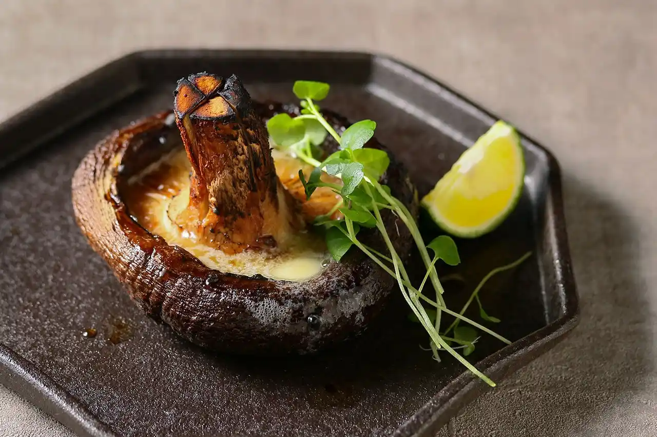 香ばしく炙った山形産の香り高い舞茸と、まろやかなコクを添えるアボカド味噌をのせた |