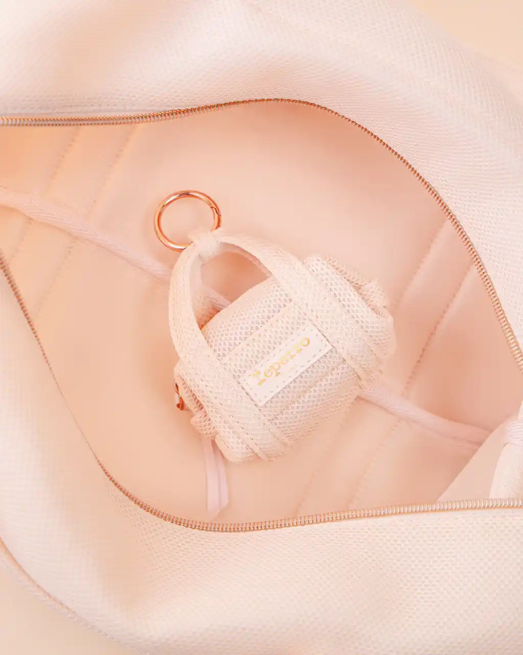 ダンスバッグやペンケースなどのアクセントとして華を添えるアイコニックなキーリングは、ローズゴールドの温かみのあるハードウェアとサテンリボンがさりげない気品を演出し、バレエの世界観を繊細に表現しています。 |