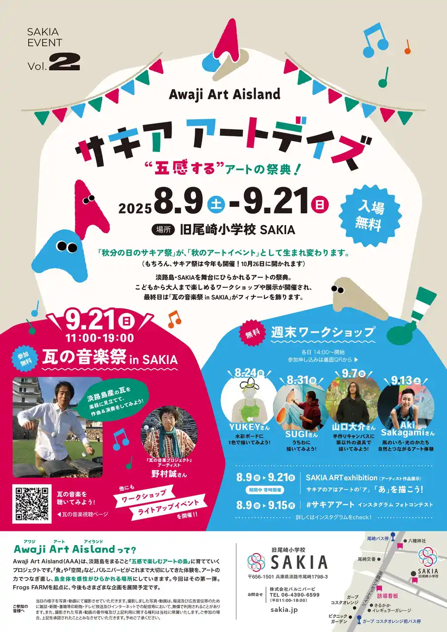 「サキア アートデイズ」は、淡路島の複合施設 SAKIA(旧尾崎小学校) を舞台に、2025年8月9日(土)~9月21日(日)まで開催される体験型アートイベントです。アート展示や音楽、週末ワークショップ(水彩画・うちわ作り・自然素材アートなど)、フォトコンテスト(#サキアアート タグ投稿)、そして地元グルメの出店など、多彩なコンテンツを通じて地域の文化と魅力を体感できる“地方創再生プロジェクト”です。 |