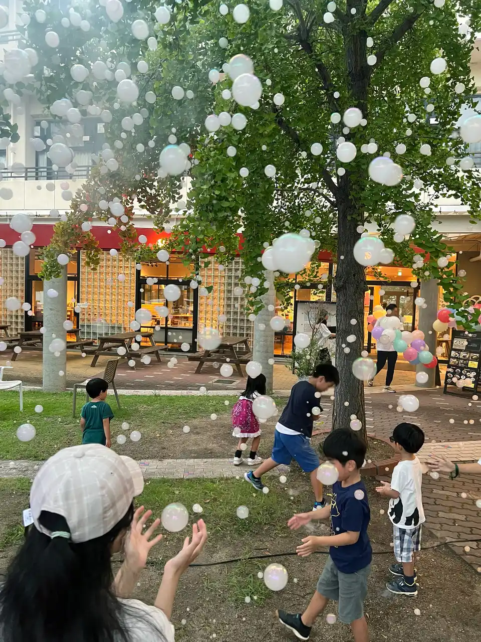 光るバルーン&シャボン玉:夜空を舞い、幻想的に会場を照らすシンボル演出に加え、来場者全員で光るうちわを振り、一つの大きなアートを創る参加型イベントも実施。小さなお子様も一緒に楽しめる、光のアート演出。 |