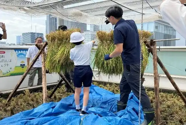 | 当社は、日本の米食文化を未来に受け継いでいくため、プレナス米文化継承活動として、様々な取り組みを行っております。その一環としてプレナス茅場町オフィス(中央区日本橋茅場町)の屋上に田んぼを作り、中央区立阪本小学校の5年生と一緒に米づくりを行う「茅場町あおぞら田んぼプロジェクト」を推進しております。このたび、9月16日(火)に、6回目となる稲刈りを実施することになりましたので、お知らせいたします。 | |||||||||