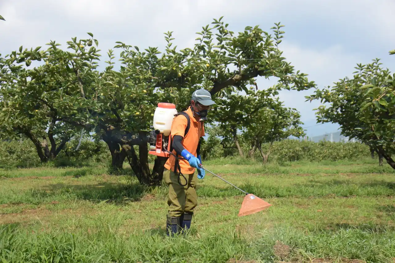 実演会は、実証実験に協力してきた「百年柿園ベル・ファーム」(鈴木義弘代表)の柿畑(豊橋市石巻萩平町)で行われました。除草剤散布の作業時間短縮を検証するため、まずは鈴木さんが従来通りタンクを背負いながら液体の除草剤をまいていきますが、薬剤を補充する時間も含めて、「身体的な負担がかなりある」と鈴木さん。一方、アダムは大容量のタンクを搭載し、鈴木さんの後を追従。重い薬剤を背負うことなく補充の手間もありません。結果、同じ面積で作業時間は半分以下に短縮。鈴木さんは「除草剤の散布だけ見ても、かなり省力化の効果を実感できた」と評価しました。 |