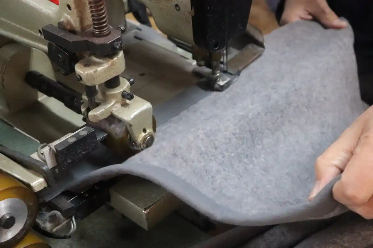 ・洗浄した反物を起毛させ毛先を揃えます。反物の端にパイピング仕上げを施して毛布が完成します。 |