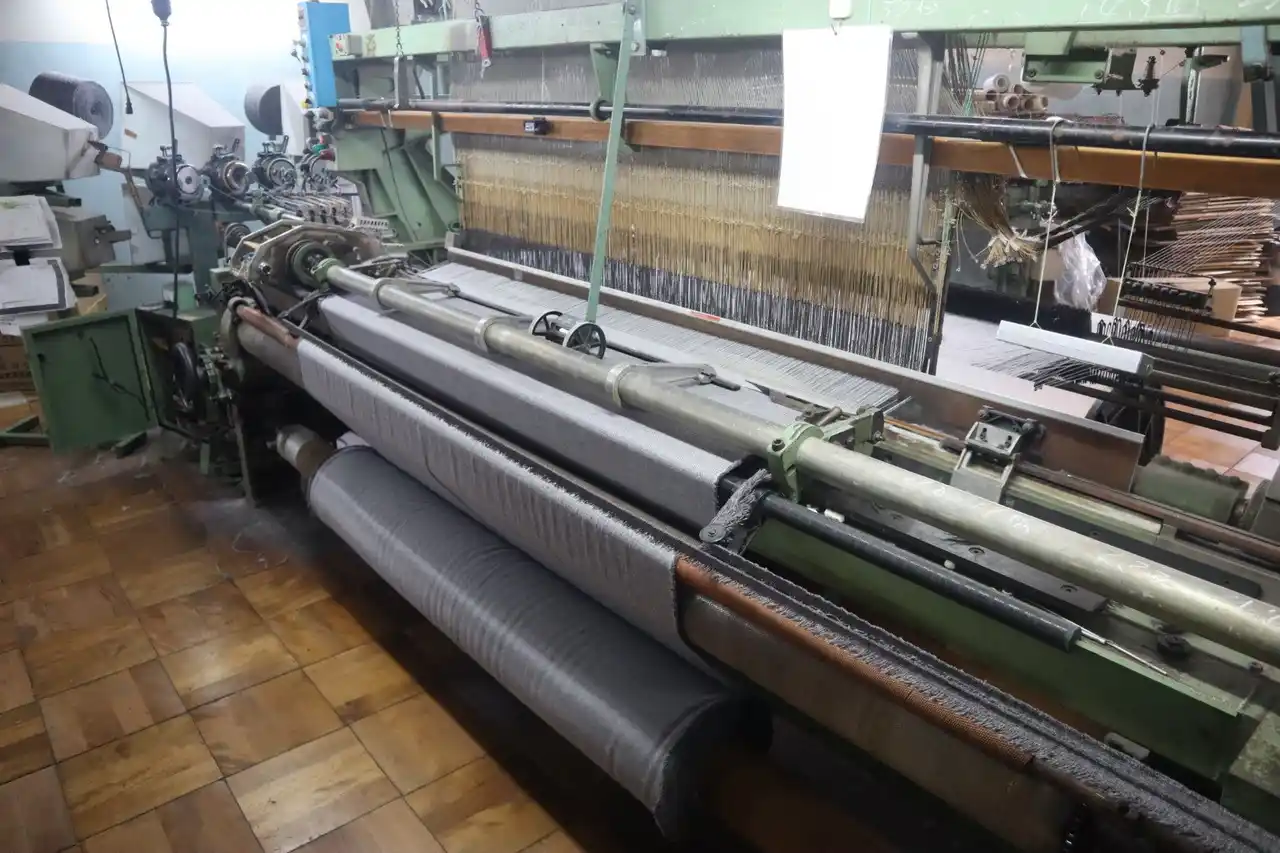 ・専用機械で撚りをかけて糸に仕上げます。この糸を紡織機で織り上げて反物にし、高温洗浄にて汚れを溶解し殺菌します。 |