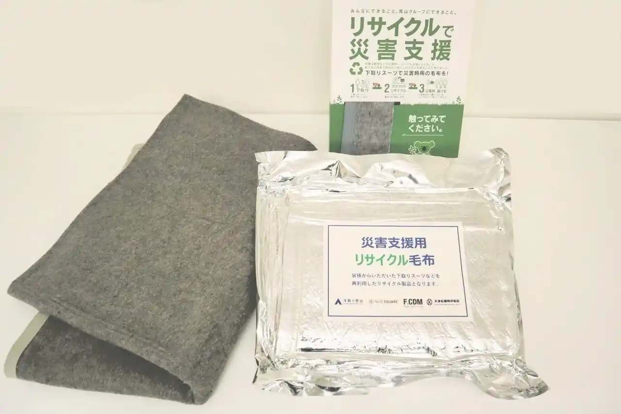 防災毛布は、店頭で回収したスーツ等の一部をリサイクルしています。当社では、お客様と協同するエコ活動の一環として、使用済みの衣料品を「洋服の青山」「スーツスクエア」などで回収しています。回収した衣類はリユース・リサイクルによって約99%再利用しており、2018年からは近年の全国的な自然災害の激甚化・頻発化を鑑みて防災毛布へのリサイクルも開始しました。全国47都道府県(離島含む)に営業店を展開する当社として、災害対策に取り組む地域住民の皆様にお役立ていただければと、2019年より自治体へ寄贈しています。また、その関係性から協定を結び、自治体と連携して地域課題の解決に寄与することを目指しています。 |