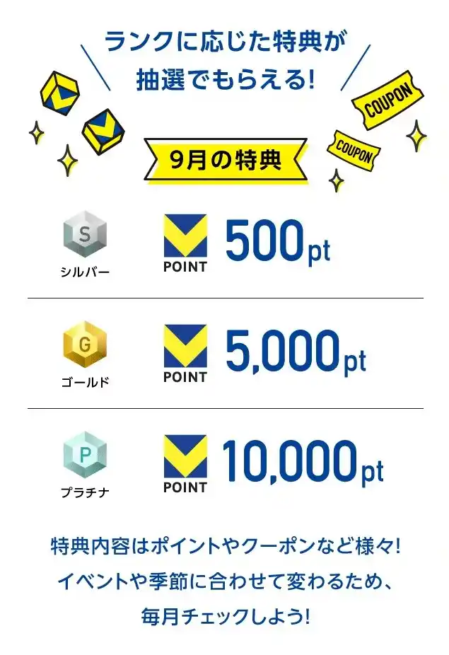 ・Vランク特典:Vランクに応じて、以下のポイントがもらえる抽選にご参加いただけます。 |