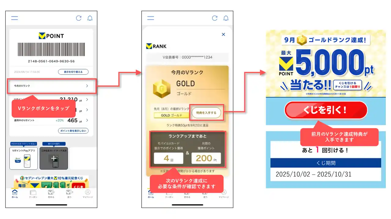 (2)VポイントアプリやVポイントサイトから「現在のランク」「ランクアップの達成状況」が確認できる! |