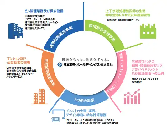 ・日本管財ホールディングス株式会社 ・日本管財株式会社 ・株式会社スリーエス ・株式会社日本管財環境サービス ・日本管財住宅管理株式会社 ・日本住宅管理株式会社 ・株式会社沖縄日本管財 ・東京キャピタルマネジメント株式会社 ・NSコーポレーション株式会社 ・株式会社ネオトラスト |